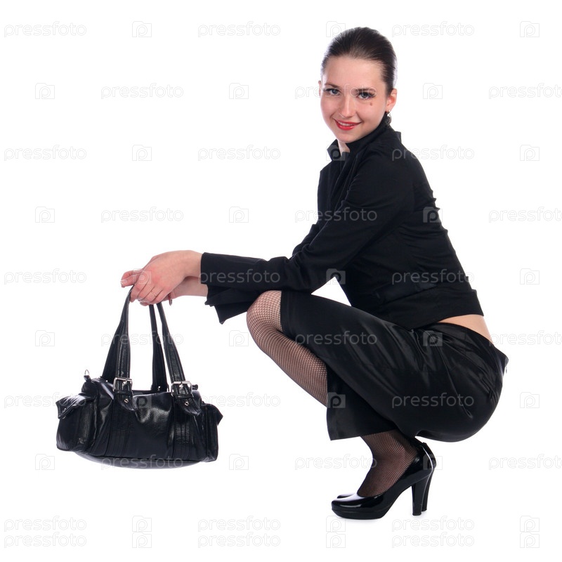 Девушка в деловом костюме с сумкой на белом фоне