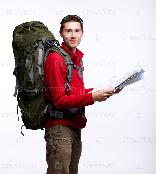 Заблудившийся путешественник смотрит на карту, изолированный на белом фоне
