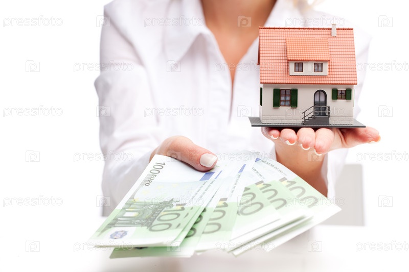 Руки с деньгами и миниатюрным домом на белом фоне