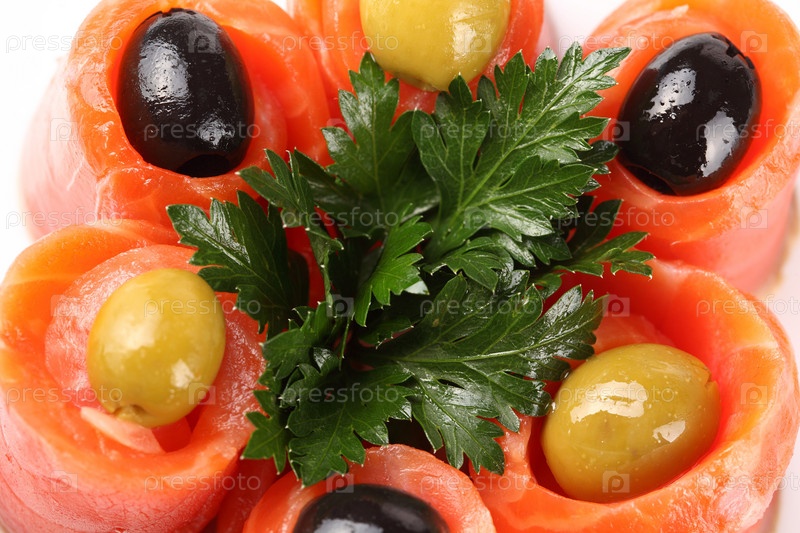 Маслины и оливки, лежащие в завернутом лососе с зеленью в центре