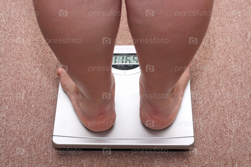 Женщина с избыточной массой тела, стоящая на электронных весах
