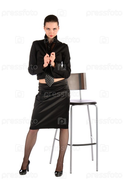 Молодая женщина стоит у стула на белом фоне