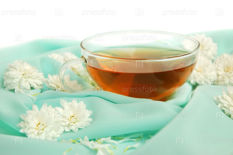 Стеклянный чайник и цветы на атласном фоне