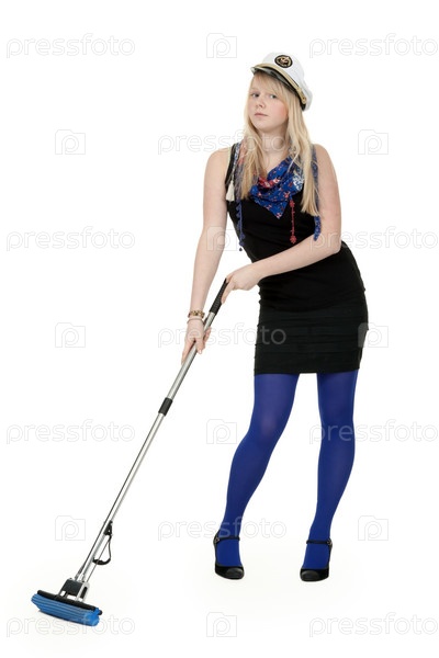 Девушка в капитанской фуражке со шваброй на белом фоне