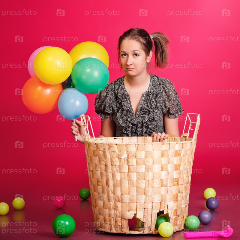 Молодая девушка сидит возле корзины со множеством разноцветных шариков на розовом фоне