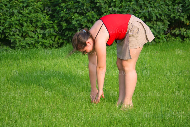 Девушка занимается гимнастикой на траве