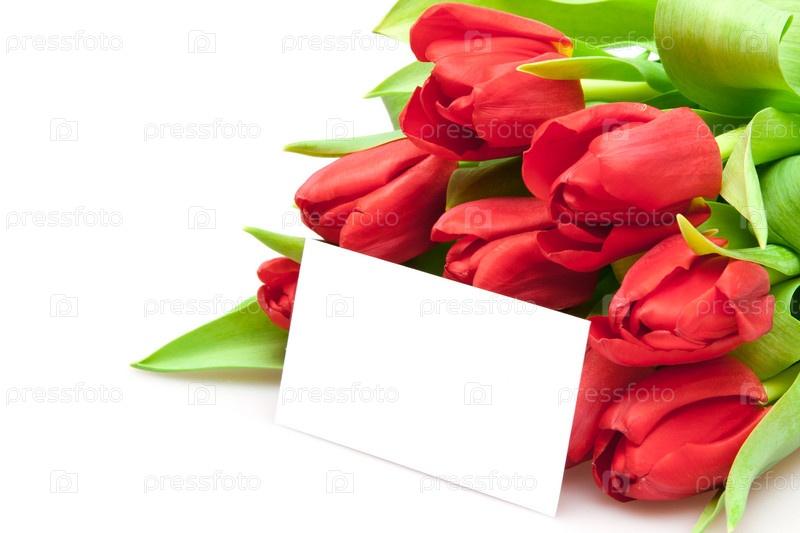 Букет красных тюльпанов с пустой карточкой на белом фоне