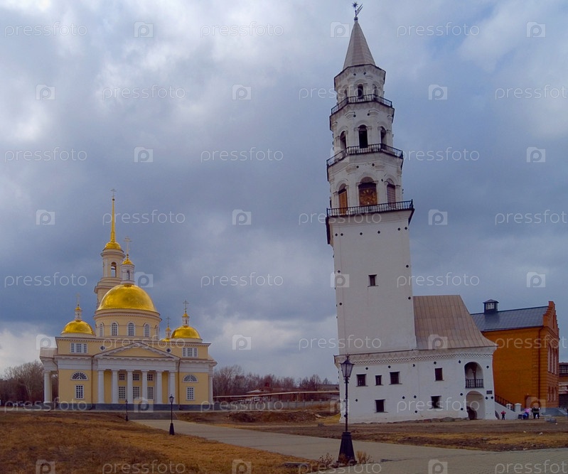 Наклонная башня Демидова на фоне Спасо-Преображенского храма.Город Невянск.Свердловская область.Россия