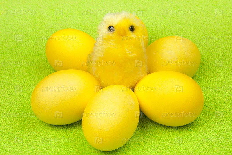 Игрушечный цыпленок среди желтых яиц на зеленом фоне