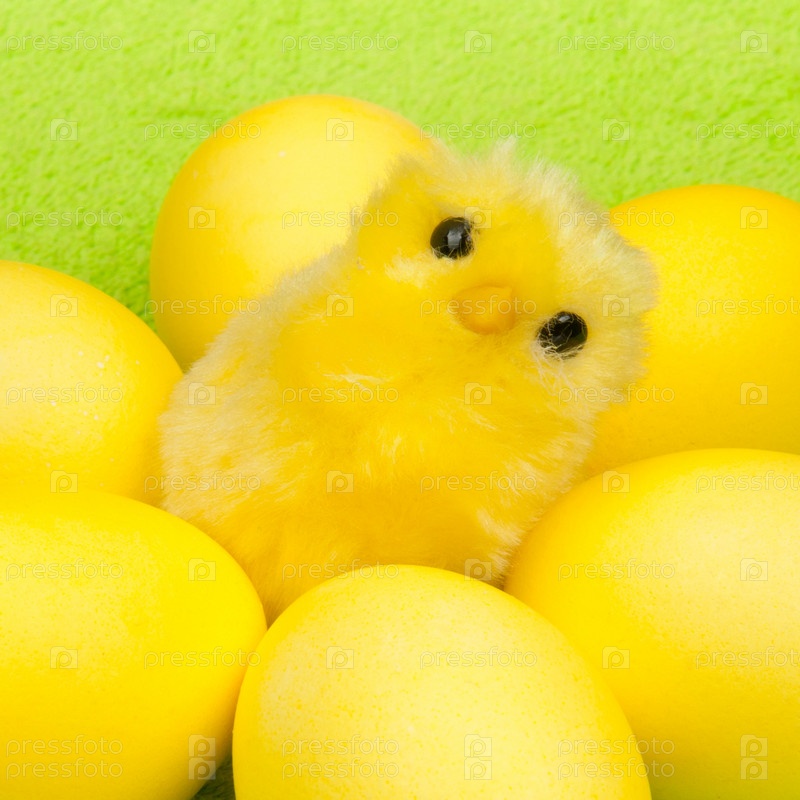 Игрушечный цыпленок среди желтых яиц на зеленом фоне