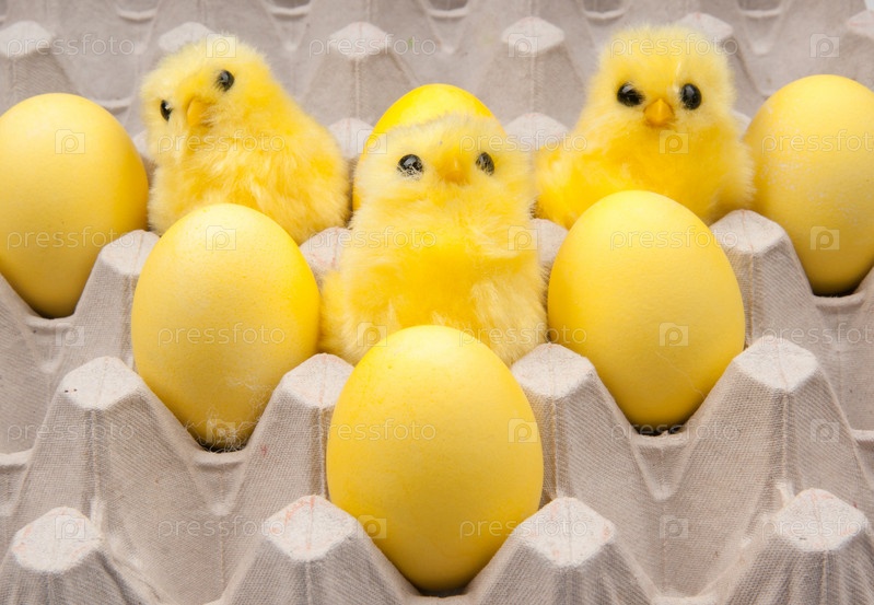 Игрушечные цыплята среди желтых яиц в упаковке