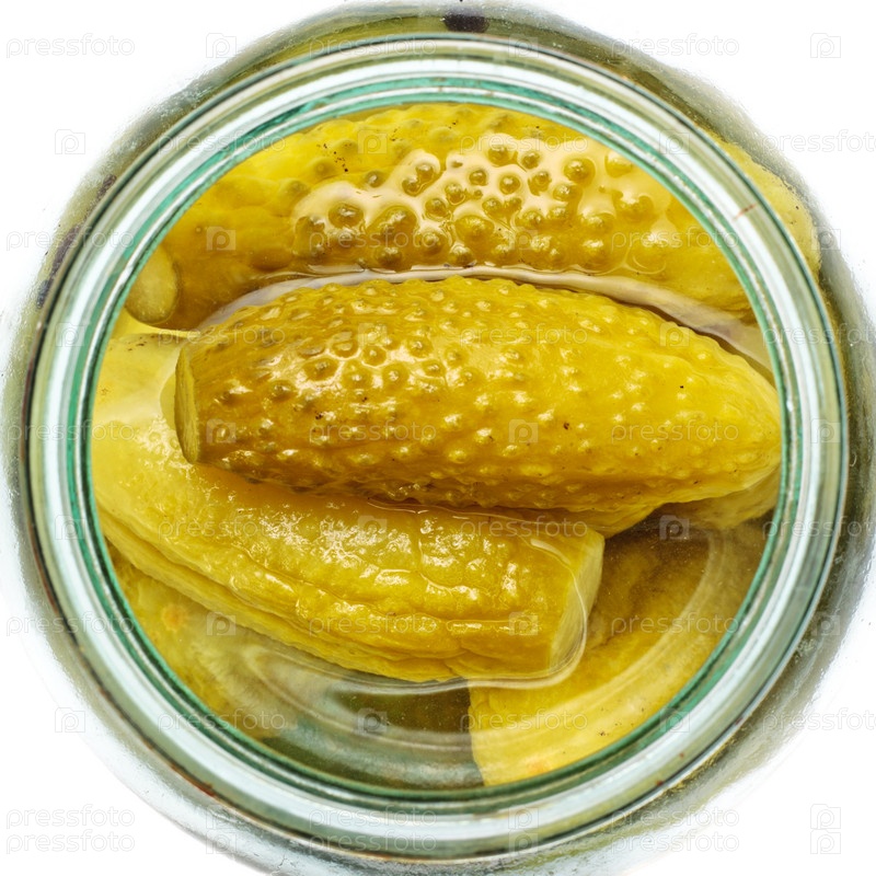 Открытая банка маринованных огурцов на белом фоне