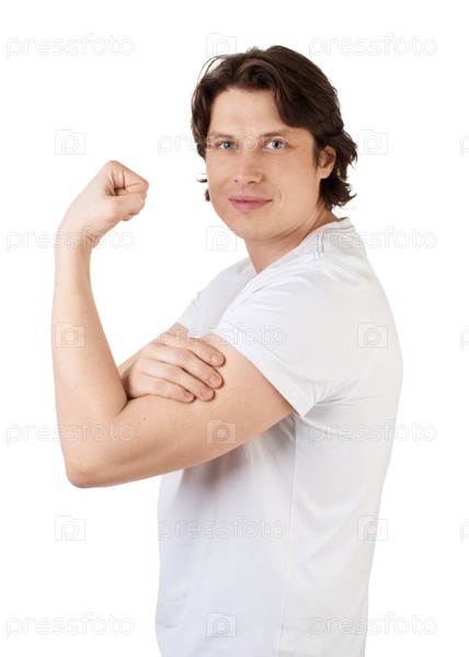 Красивый молодой человек демонстрирует свои мускулистые бицепсы и улыбается, на белом фоне