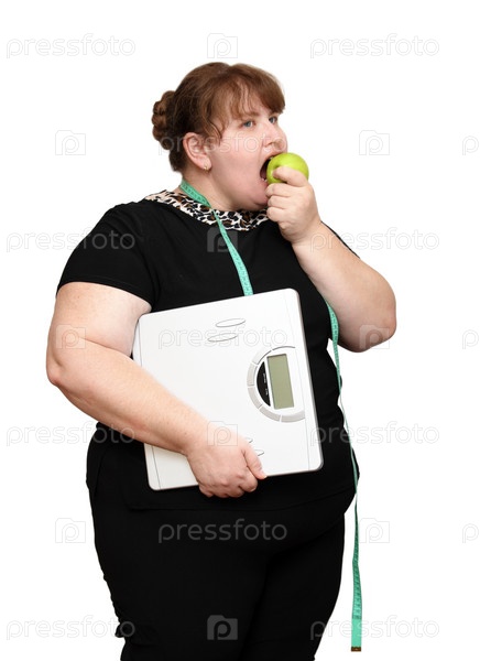 Женщина с избыточным весом держит напольные весы и ест яблоко