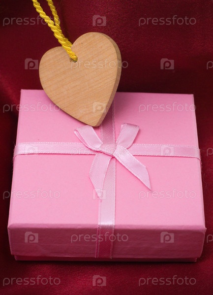 Деревянное сердце и подарок на атласной драпировке - Сувенир в день святого Валентина (Valentine's Day)