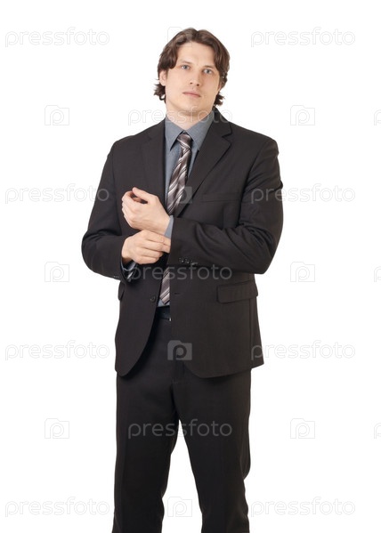 Портрет уверенного бизнесмена, поправляющего рукав рубашки, на белом фоне