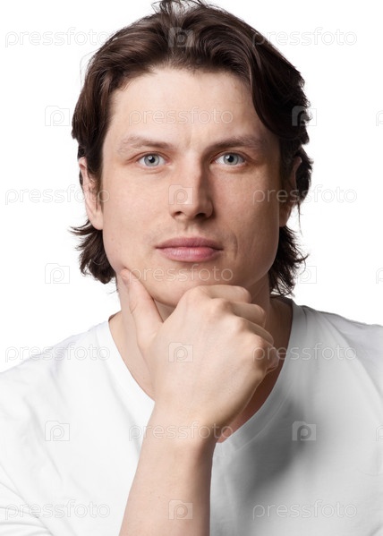 Портрет красивого молодого мужчины, одетого в белую футболку, на белом фоне