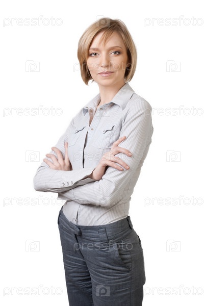 Привлекательная деловая женщина со скрещенными руками на белом фоне