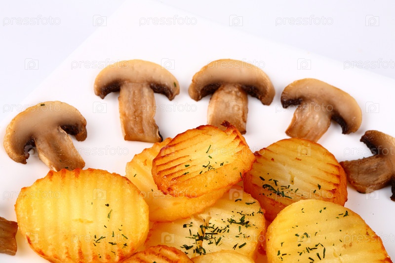 Жареные картофель и грибы на белом фоне