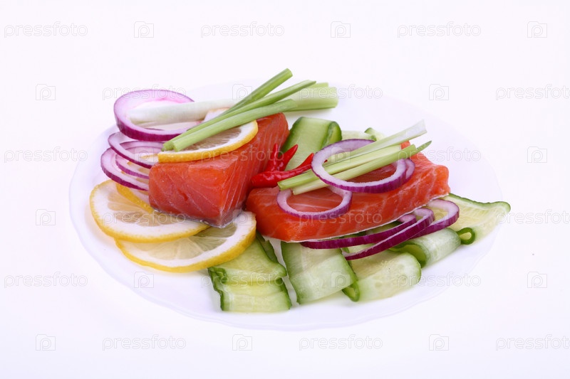 Ломтики красной рыбы с овощами, зеленью и лимоном на белой тарелке