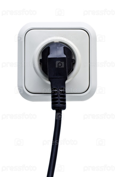 Штепсель, воткнутый в розетку на белом фоне
