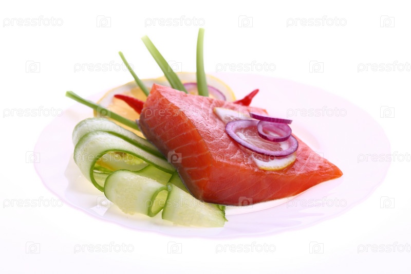 Ломтик красной рыбы с овощами, зеленью и лимоном на белой тарелке