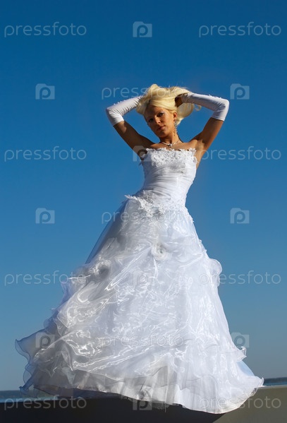 Светловолосая невеста на фоне голубого неба