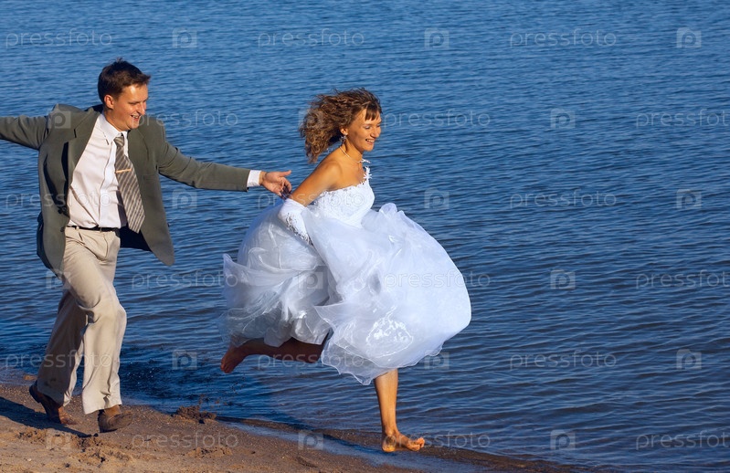 Невеста и жених бегут по пляжу