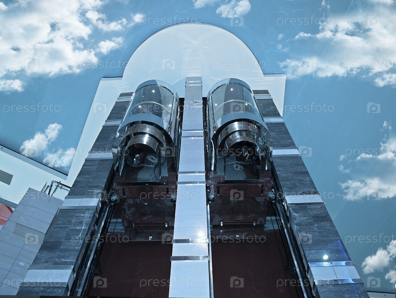 Лифты в современном здании на фоне голубого неба