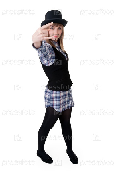 Девушка с нарисованными усами и в черном котелке на белом фоне