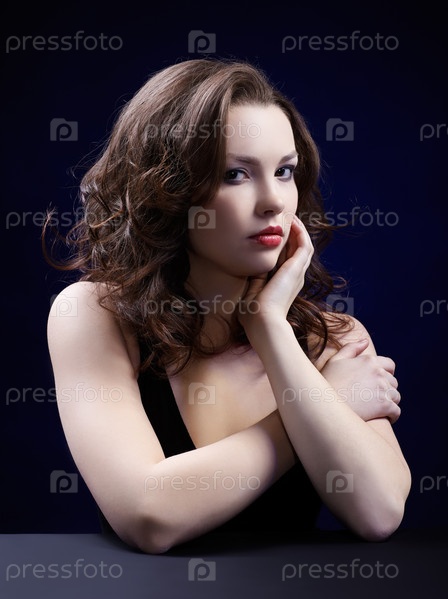 Портрет кудрявой брюнетки на синем фоне