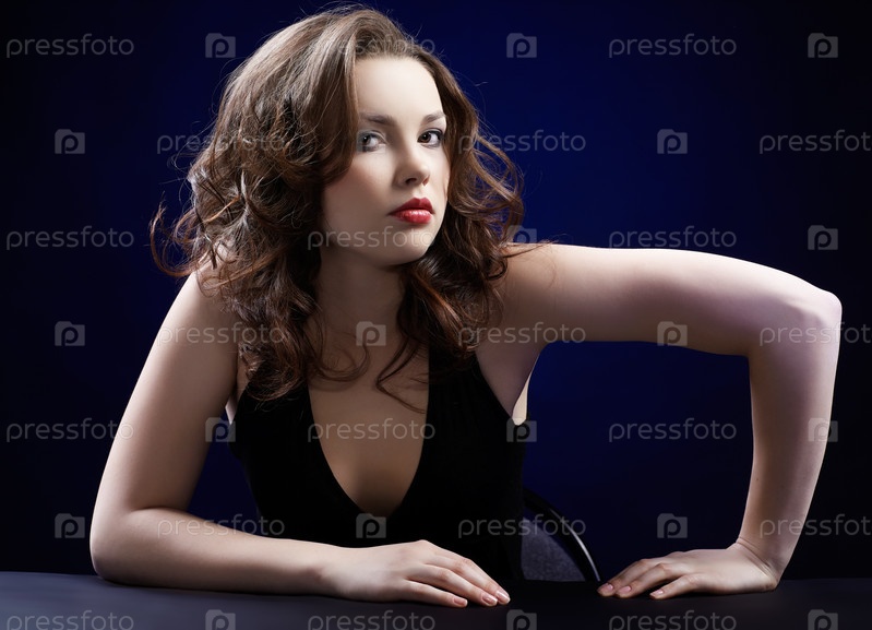 Портрет кудрявой брюнетки на синем фоне