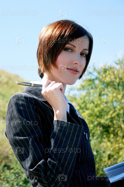 Молодая бизнес-леди на природе с ручкой