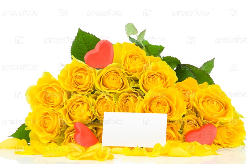 Букет желтых роз с пустой карточкой, изолированный на белом фоне