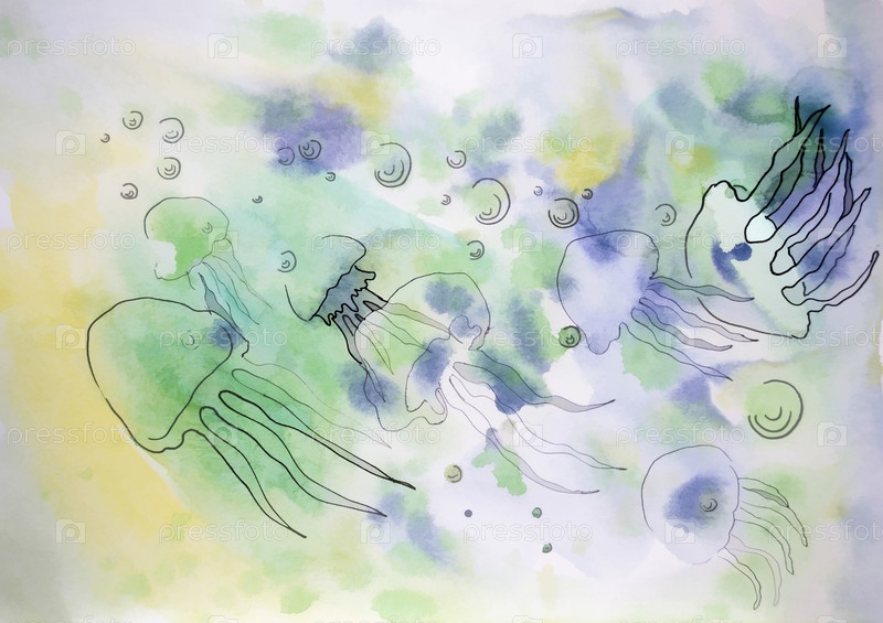Медузы, нарисованные акварелью и тушью