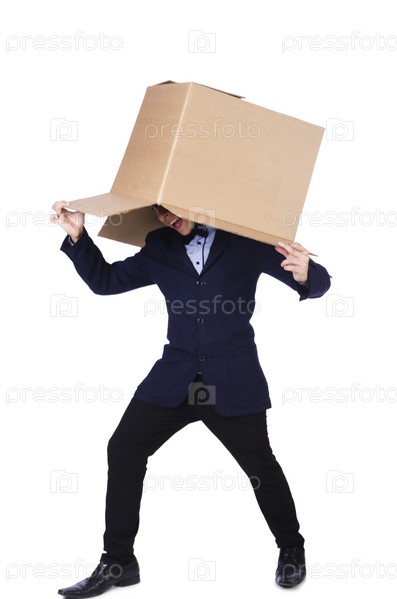 Бизнесмен с коробкой, изолированный на белом