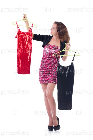 Женщина меряет одежду на белом фоне