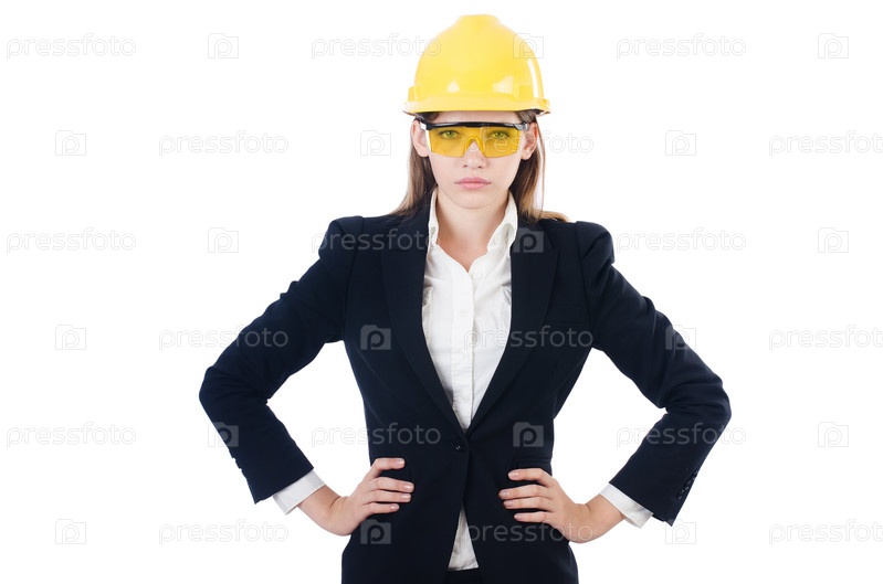 Молодая бизнес-леди в каске на белом