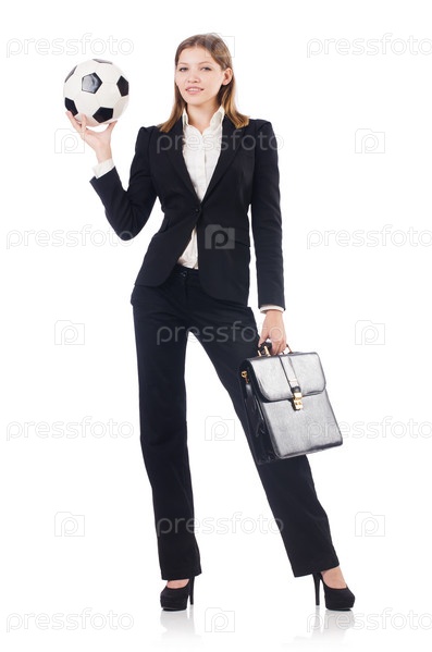 Бизнес-леди с мячом на белом фоне