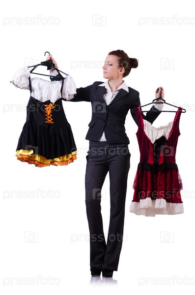 Женщина меряет одежду на белом фоне