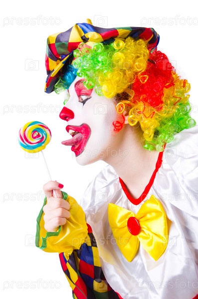 Клоун с леденцом, изолированный на белом фоне