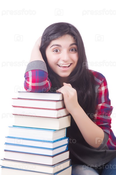 Молодая студентка с книгами на белом фоне