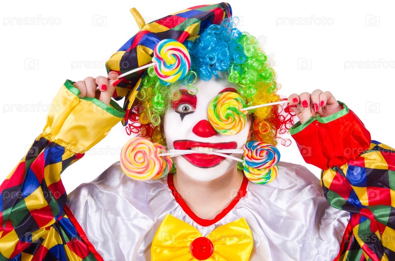 Клоун с леденцом, изолированный на белом фоне