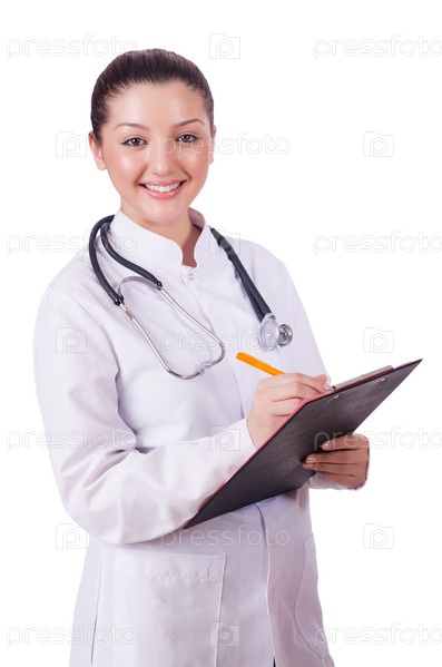 Молодая женщина-врач на белом фоне