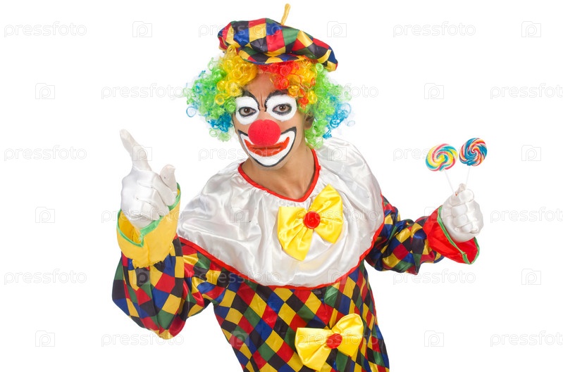 Клоун с леденцами, изолированный на белом фоне