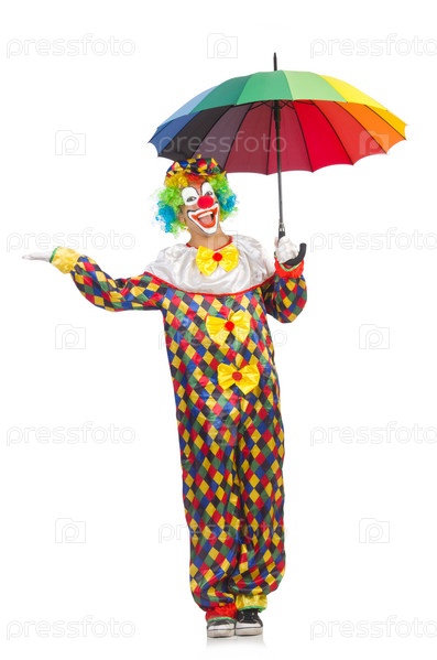 Клоун с зонтиком, изолированный на белом фоне
