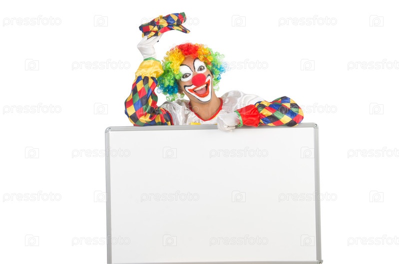 Клоун с пустым баннером на белом фоне