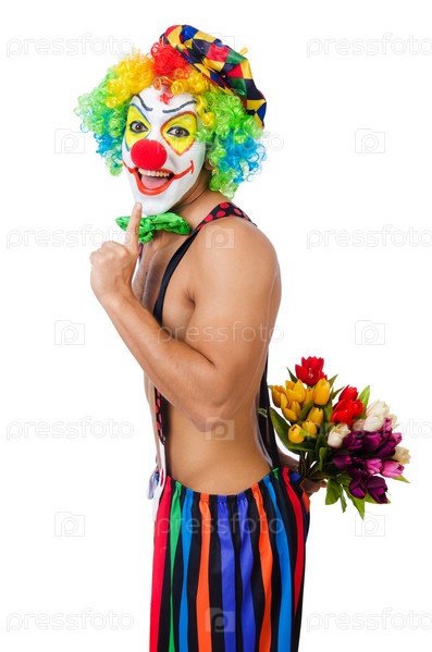 Клоун с цветами на белом фоне