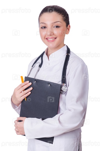 Молодая женщина-врач на белом фоне