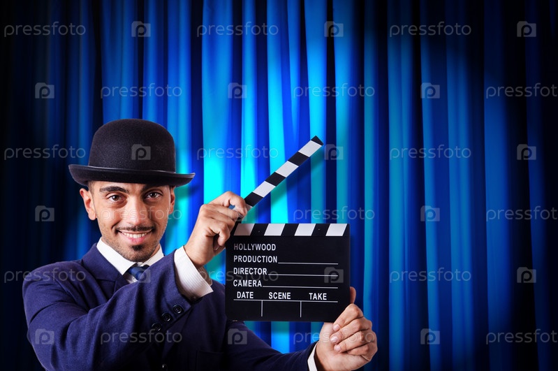 Человек с хлопушкой на фоне занавеса